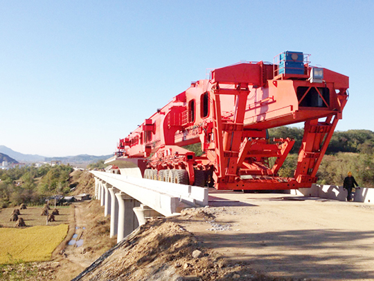 以及生產(chǎn)更新運架產(chǎn)品能架設(shè)跨度40M高速鐵路箱梁的:SXJ1000T/40M一跨式架橋機(jī)(配套攀爬式運梁車可以實現(xiàn)過隧道零距離架梁)和攀爬式運梁車。并能對現(xiàn)有32M分體式運架設(shè)備進(jìn)行改造,改造后能實現(xiàn)高低位架設(shè)跨度40M高速鐵路箱梁(高位改造不能過隧道,把原架橋機(jī)改造一跨式,把原運梁車增加2軸。低位改造能過隧道架梁,把原架橋機(jī)改造一跨式低位,把原運梁車改成攀爬式運梁車并增加二臺喂梁臺車實現(xiàn)過隧道架梁)。